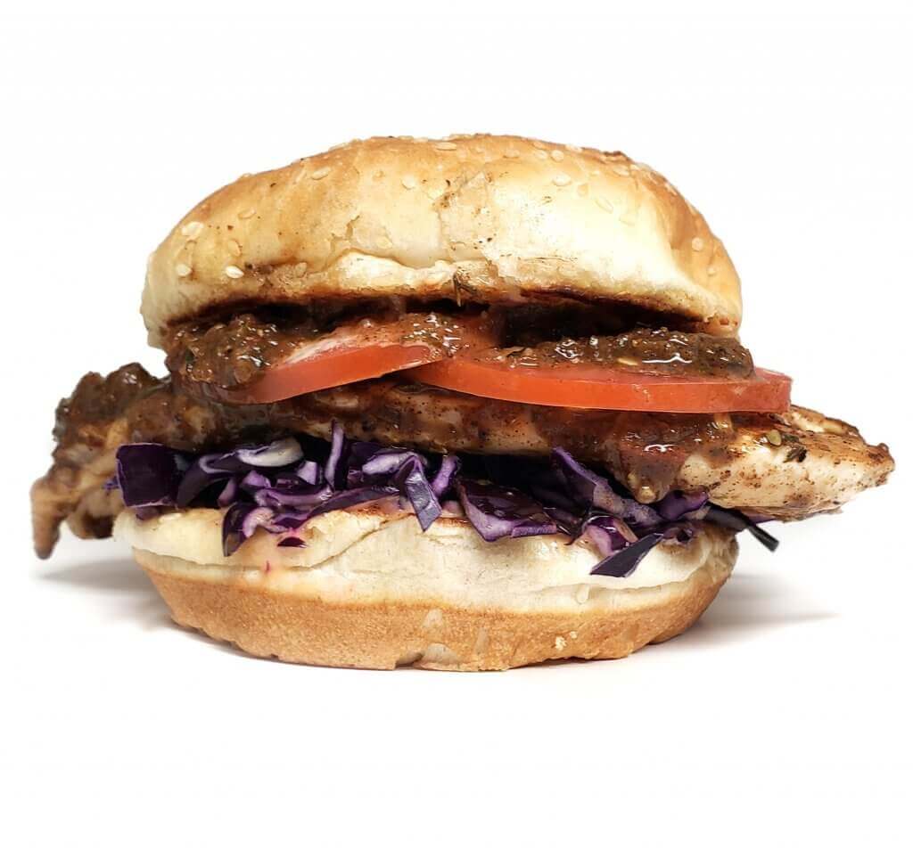 Fresh chicken breast, tossed with our own Jerk spice rub, sitting on a bed of red cabbage slaw, topped with more Jerk sauce.