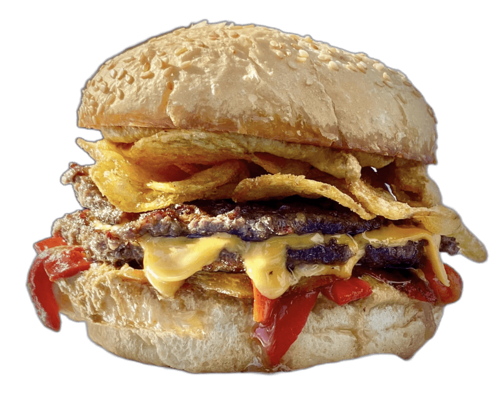 Single, Double or Triple patty, cheese, our own jalapeno-chipotle sauce, roasted red peppers, and topped with ghost pepper chips.